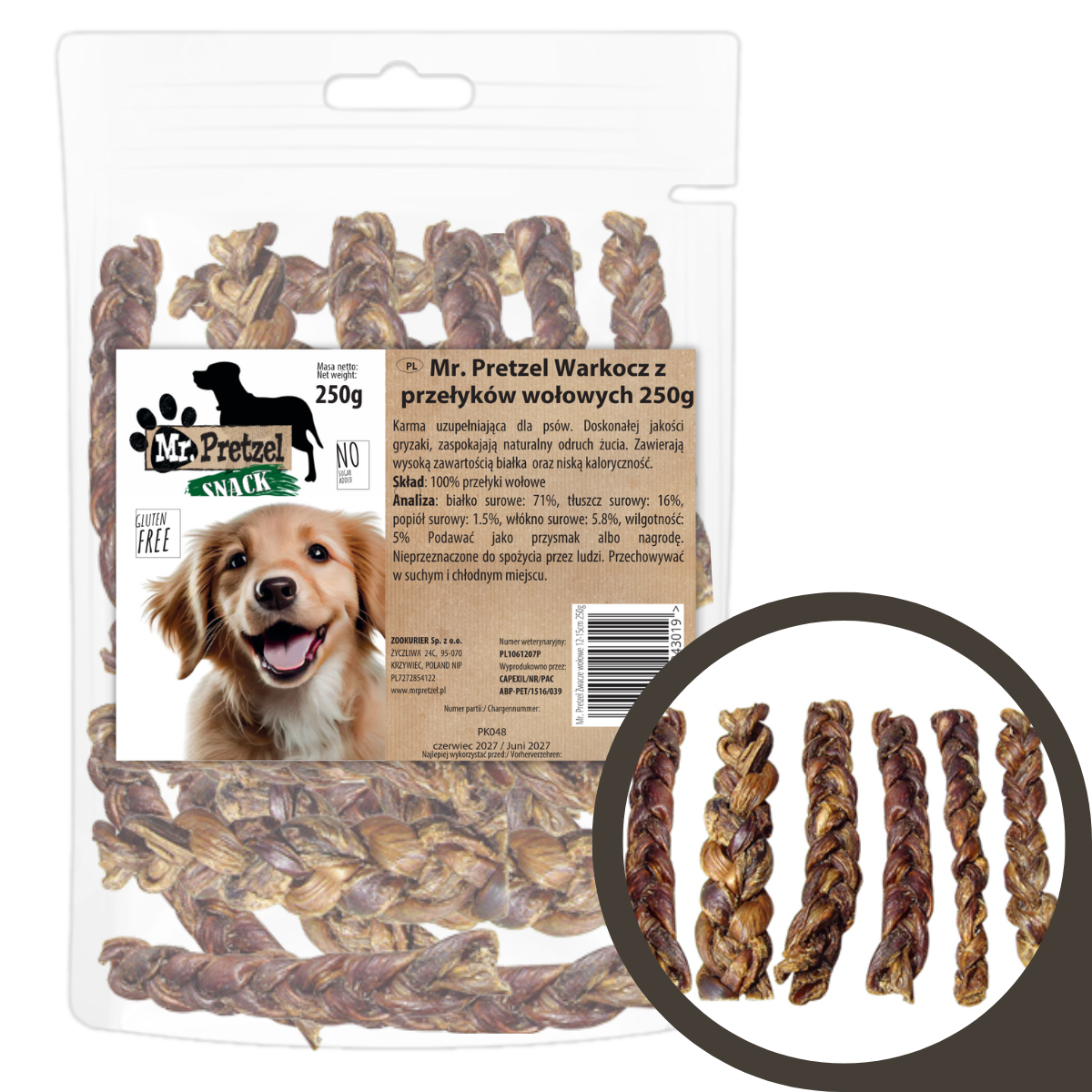 Warkocz z przełyków wołowych Mr. Pretzel to idealny wybór dla psów o różnych wielkościach i rasach, które uwielbiają naturalne, zdrowe przekąski. Długi termin przydatności zapewnia wygodę przechowywania, a Twój pupil z pewnością doceni ich smak i aromat.